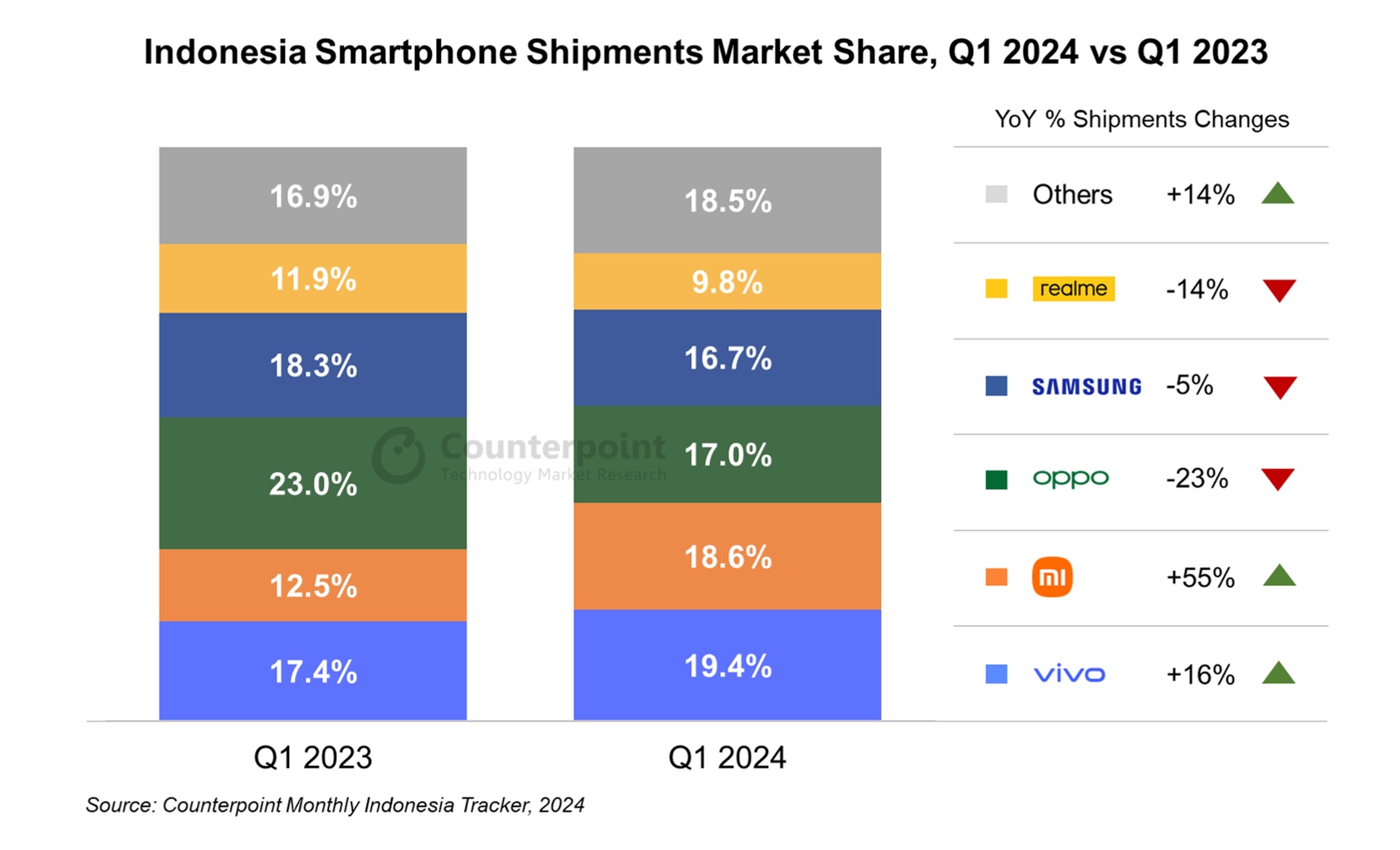 - 智能手机品牌总出货量同比添加 4%:与 2023 年同期相比,2024 年第一季度,智能手机厂商在印尼的出货量添加了 4%。